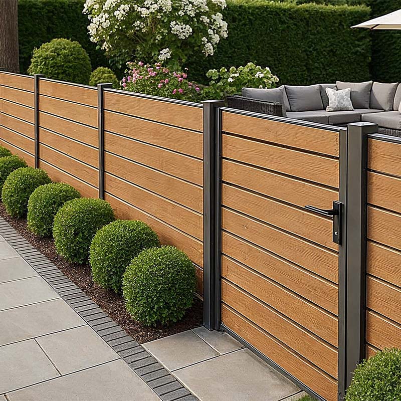 GoldFence wood-effect aluminum fences bring prestige and refinement to your outdoor spaces. Designed with realistic wood textures and clean architectural lines, they combine the timeless warmth of wood with the enduring strength of aluminum.