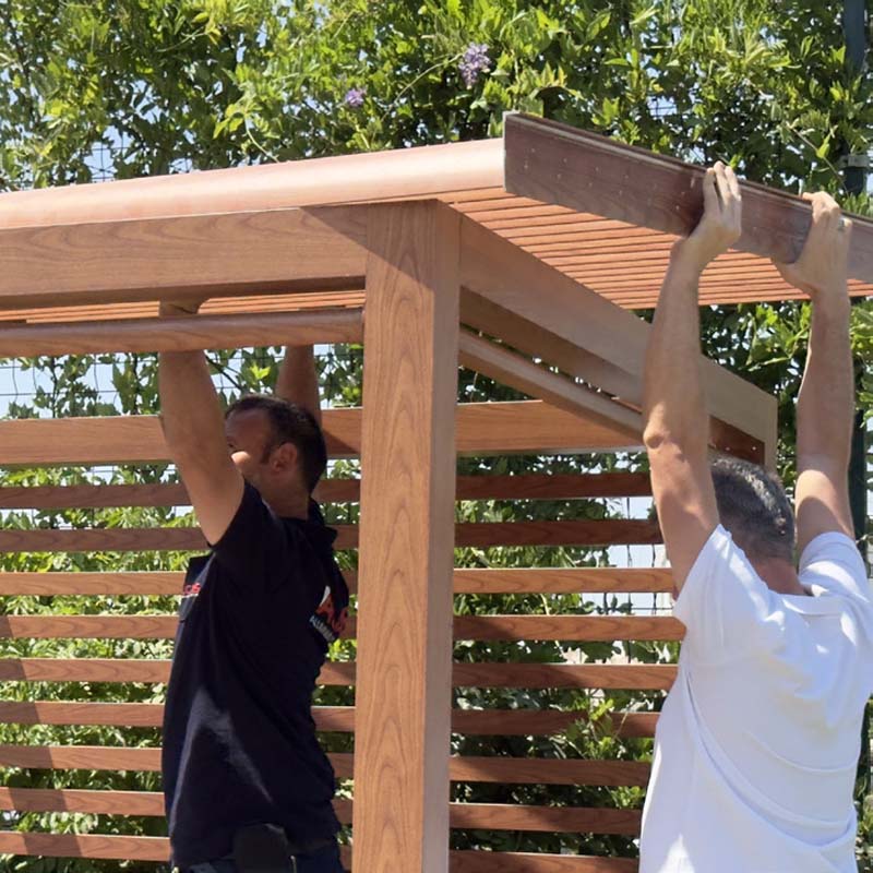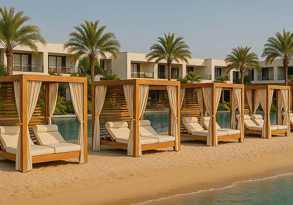 The fixed aluminum sunshades positioned on the roof and head section create a comfortably shaded area, while the remaining sides can be equipped with optional curtains or left open for a more spacious and airy design.