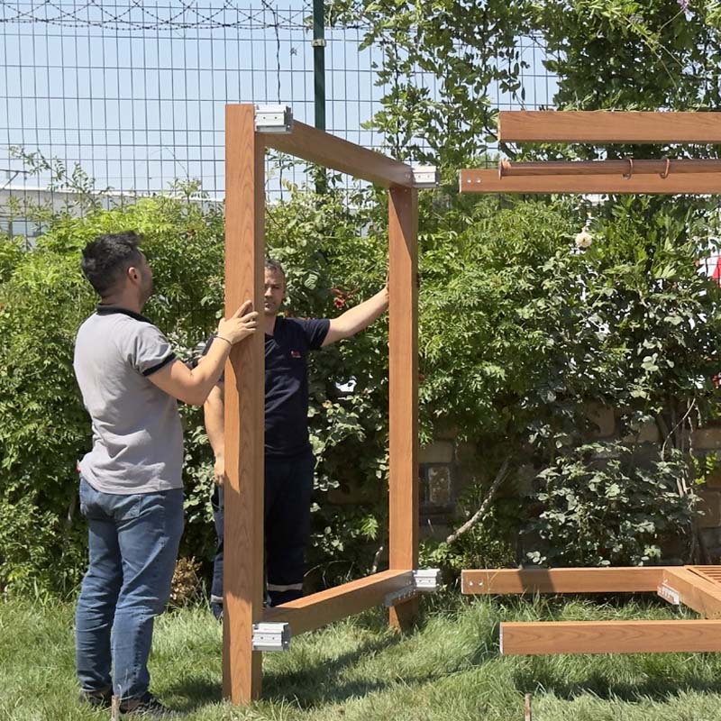 GoldLounge is a unique lounge room crafted from wood-patterned aluminum profiles, blending refined elegance with lasting functionality.